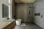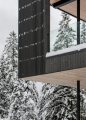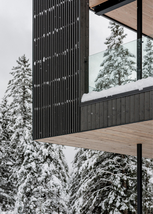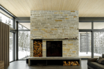 Projekt pracuje s omezenou paletou přírodních materiálů – dřevem, kamenem a ocelí. Ty se uplatňují v konstrukci i v povrchových úpravách, a to jak v exteriéru, tak v interiéru. Díky tomu působí dům kompaktně a materiálově sjednoceně.