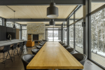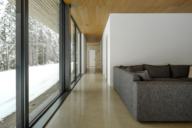 Dřevěná konstrukce umožnila subtilní řešení střechy, která reaguje na orientaci ke slunci i na výhledy do krajiny. Pod její linií probíhá pás horního zasklení, jenž přivádí do interiéru rovnoměrné světlo a udržuje vizuální kontakt s okolní zelení.