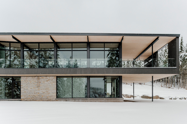 Podélný objem sleduje terén a reaguje na linii řeky i stávající vegetaci. Dům je částečně fragmentovaný, což mu pomáhá lépe zapadnout mezi vzrostlé stromy. Fasádu horního podlaží tvoří vertikální dřevěné obložení, přízemí je řešeno kamenným soklem. Kombinace těchto materiálů vychází z místního kontextu a podporuje přirozené začlenění stavby do krajiny.
