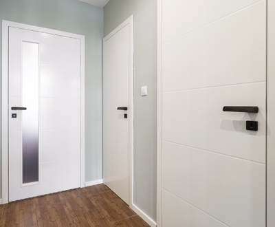 Bílé bezfalcové dveře EBC QUATRO v plné i prosklené variantě.