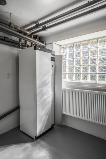 Kompletní systém pro topení nebo chlazení a pro ohřev teplé vody tvoří v případě tohoto domu tepelné čerpadlo NIBE F2120-16 s vnitřní systémovou jednotkou VVM S320.