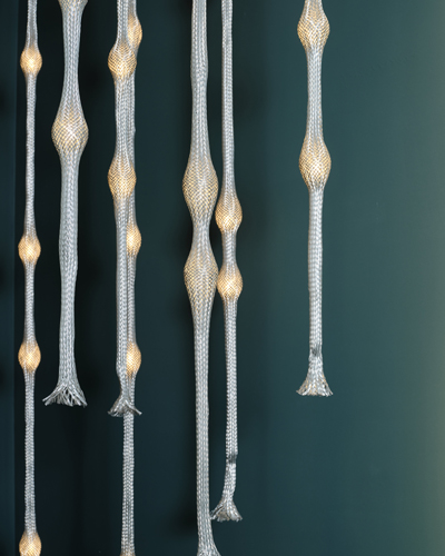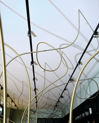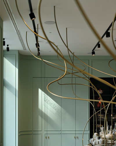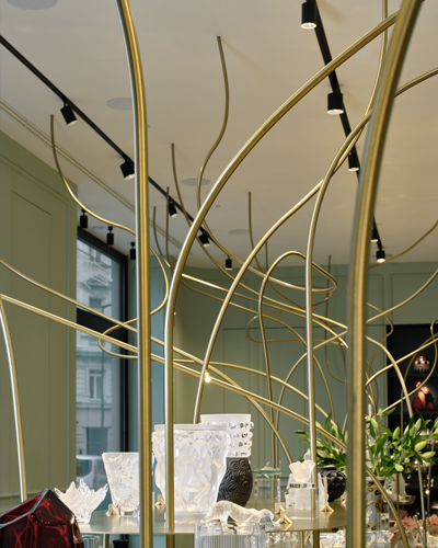 „Při scházení do patra zaujme také netradiční schodišťový lustr Liana vyrobený designovou společností Lasvit z laboratorního skla a kovového opletu, který navrhl Maxim Velčovský. Cena za tento originální designérský skvost se pohybuje v hodnotě dvou milionů korun.“