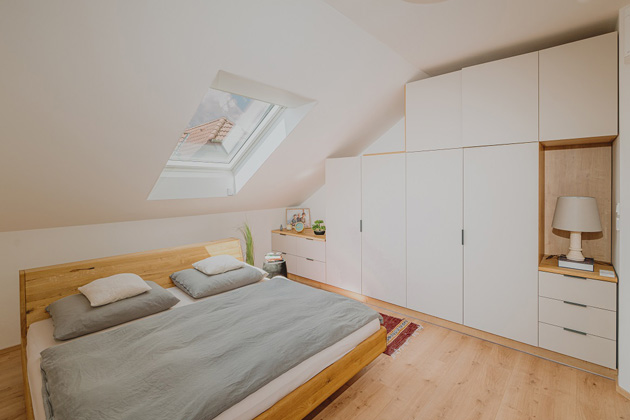 Společně s architektem vymysleli nové dispozice a rozměry oken a jejich plochu téměř zdvojnásobili. Díky tomu dostali do prostoru více denního světla a místnosti lze i lépe vyvětrat. "S čím jsme tady v podkroví hodně bojovali, bylo teplo. Proto jsme zvolili okna s venkovními roletami," říká paní domu a dodává, že si bez nich už neumí představit léto.