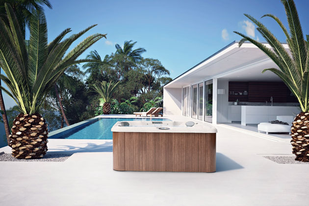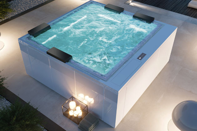Venkovní hydromasážní bazén Phantom (Treesse), celkem 20 trysek, systém cirkulace vody, elektronický ohřívač vody, sklolaminát, umělý kámen, gel Coat, 235 × 235 × 98 cm, cena na dotaz, www.treesse.cz