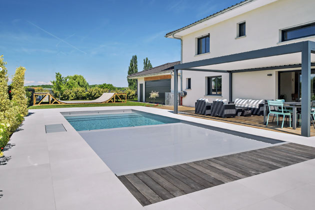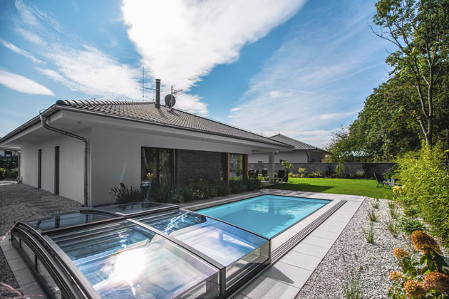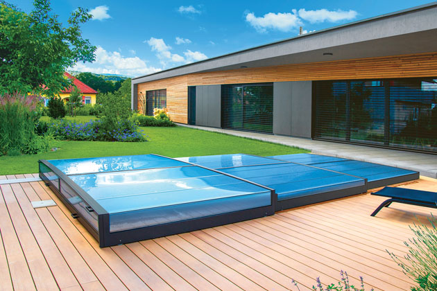 Automatický kryt (Desjoyaux) lze umístit na okraj bazénu nebo může být zabudován přímo do bazénového tělesa, zabezpečení proti pádu, nečistotám i odparu vody a udržování teploty, testováno na zatížení 100 kg, cena na dotaz, www.desjoyaux.cz