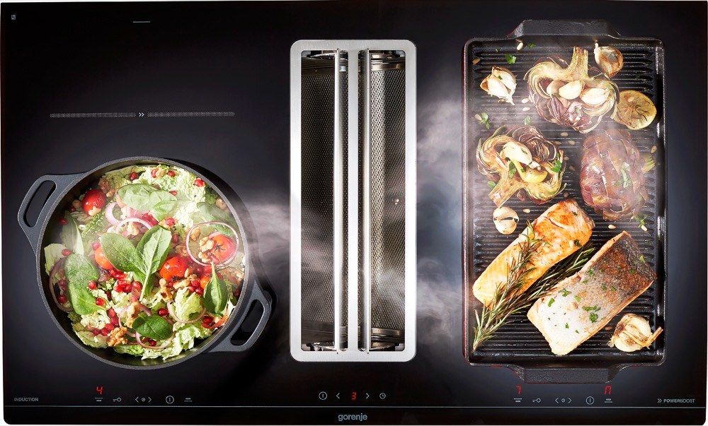 Čtyři varné zóny nové indukční varné desky Gorenje Omniflex lze svisle spojit do dvou velkých varných zón pro rovnoměrné vaření nebo grilování ve větších hrncích a pekáčích.