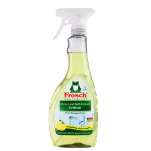 Eko čistič na koupelny a sprchy (Frosch), na bázi kyseliny citronové, cena 100 Kč / 500 ml → www.frosch-eko.cz