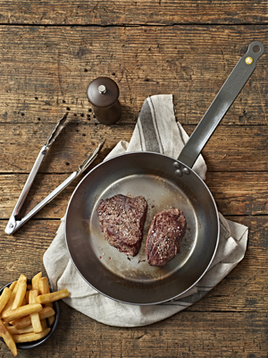 Na steak je třeba zvolit pánev, která dobře vodí a udržuje teplo. Ideální jsou litinové páve, které jsou velice odolné, takže nemění tvar, a skvěle udržují teplotu. Je třeba ale počítat s tím, že vyžadují speciální údržbu. Vhodné jsou i pánve z oceli, u kterých lze, stejně jako u litiny, správným počátečním vypálením docílit nepřilnavého povrchu. Litinovou i ocelovou pánev je ale třeba po umytí okamžitě osušit. V žádném případě nepatří do myčky, kde by rezivěly. Další možností jsou masivní pánve z kvalitního nerezu, které sice nemají tak velkou tepelnou setrvačnost, ale snadno se udržují. Na steaky je také možné použít pánev s nějakým kvalitním nepřilnavým povrchem a silným sendvičovým dnem. Toto řešení ovšem profesionálové přenechávají většinou laikům.