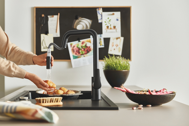 Eurosmart (Grohe), stojánková baterie s vytahovací sprškou, na níž lze pohodlně přepínat mezi silným proudem a laminárním proudem bez rozstřikování vody, cena 10 780 Kč → www.grohe.cz