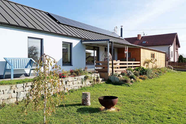 Zvolena byla varianta SATJAM Rapid v antracitové barvě, která svým vzhledem napodobuje falcovanou střechu. Je lehká, kompaktnější a odolná vůči větru a sněhové zátěži. „Střecha SATJAM Rapid je opatřena naklapávacími zámky, takže její montáž je rychlá a v tomto případě poměrně snadná. Důležitá je ale správná skladba střechy, aby se předešlo případným komplikacím,“ říká Ing. Petr Tureček, produktový manažer společnosti SATJAM. Na východní část domu je přisazena dřevěná kůlna, která kontrastuje se světlou omítkou domu. Pod štítem domu přechází v kryté stání pro auta a zároveň ukrývá a chrání vchod do domu.