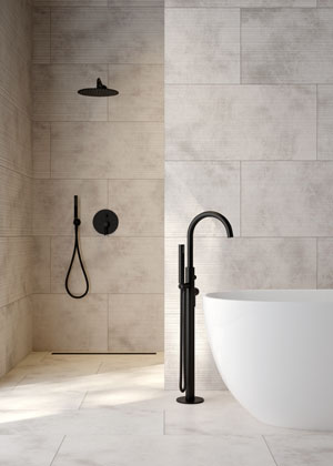 Foto: OltensMolle (Oltens), volně stojící vanová baterie s ruční sprchou, grafitové provedení, materiál mosaz, výška 106 cm, cena na dotaz → www.oltens.com