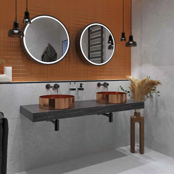 Hermes Metallica (SIKO), koupelnový koncept s reliéfními metalickými pásky s měděným vzhledem Vilar Albaro, cena 1 099 Kč/m2 → www.siko.cz