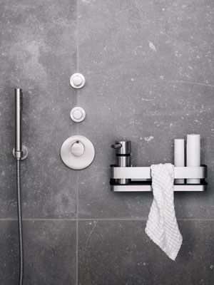 Foto: BlomusNexio (Blomus), polička do sprchového koutu v matném nerezovém provedení, lze připevnit i bez vrtání, šířka 25 cm, cena 2 357 Kč → www.blomus.cz