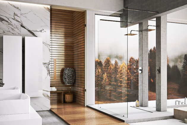 Základním předpokladem kvalitního domácího wellness je prostor, kde můžete volně dýchat, pohybovat se, uvolnit se. Může mít podobu celé místnosti nebo třeba jen velkorysého walk-in koutu s oversize hlavovou sprchou.